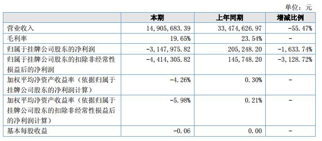 本期公司實現(xiàn)營業(yè)收入1,490.57萬元,較上年同期3,347.46萬元下降55.47%,主要是因為18年新年在2月份,17年新年在1月份,導(dǎo)致訂單貨期推遲了一個月左右,重要客戶的大部分產(chǎn)品主要在7月份開始才陸續(xù)出貨,因此本期確認(rèn)的收入大幅下降;營業(yè)成本1,197.61萬元,較上年同期2,559.51萬元下降53.21%,營業(yè)成本的下降趨勢與銷售收入減少保持一致;毛利率19.65%較上年同期23.54%下降3.89%;本年虧損314.80萬元,主要是因為上半年銷售規(guī)??s小,而部分成本費用相對固定,公司盈利空間進一步壓縮所致。?