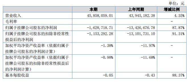 報告期內(nèi)營業(yè)收入為45,858,059.01元,比去年同期增長4.35%,歸屬于掛牌公司的股東凈利潤-1,628,718.71元,比去年同期增加87.87%?;久抗墒找?0.05元,比去年同期增加88.37%。?