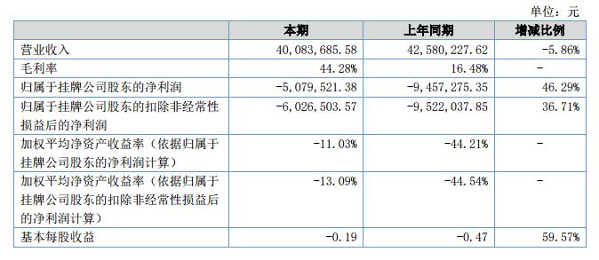 報(bào)告期內(nèi),公司主營(yíng)業(yè)務(wù)未發(fā)生重大變動(dòng),2018年上半年,公司營(yíng)業(yè)收入40,083,685.58元,同比下降5.86%%;歸屬母公司的凈利潤(rùn)為-5,079,521.38元,較去年同期上漲4,377,753.97元。截至2018年6月30日,公司總資產(chǎn)為199,918,724.89元,凈資產(chǎn)為49,498,873.64元;公司上半年經(jīng)營(yíng)性凈現(xiàn)金流為-9,661,296.29元,上年同期-14,923,722.78元,增加5,262,426.49元。?