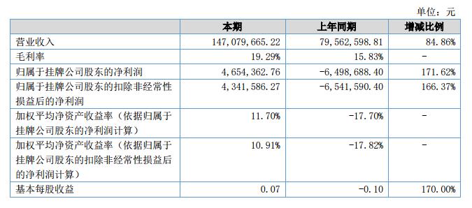 報告期內(nèi)公司實現(xiàn)合并營業(yè)收入147,079,665.22元,較去年同期增長84.86%;報告期內(nèi)凈利潤7,515,541.05元,較去年同期增長234.78%。