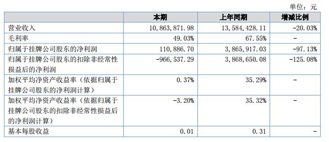 本期實(shí)現(xiàn)營業(yè)收入1,086.39萬元,相比上年同期減少了20.03%,凈利潤11.09萬元,相比上年同期減少了97.13%。?