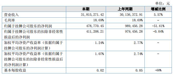 報(bào)告期內(nèi)實(shí)現(xiàn)營(yíng)業(yè)收入31,815,271.42元,較去年?duì)I業(yè)收入上升5.57%;報(bào)告期內(nèi)實(shí)現(xiàn)凈利潤(rùn)478,770.45元,比上年同期下降了40.47%。?