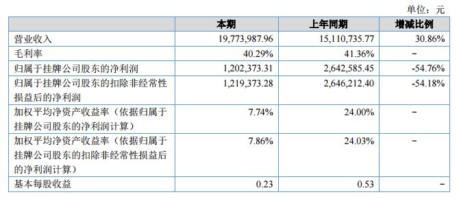 報(bào)告期內(nèi)實(shí)現(xiàn)營(yíng)業(yè)收入19,773,987.96元,同比增長(zhǎng)30.83%,凈利潤(rùn)1,202,373.313元,同比下降-54.50%,總資產(chǎn)25,059,815.84元,同比增長(zhǎng)11.81%,凈資產(chǎn)15,495,774.25元,同比增長(zhǎng)8.05%,?