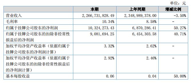 報(bào)告期內(nèi),公司營(yíng)業(yè)收入(合并口徑,未經(jīng)審計(jì),下同)22.67億元(人民幣,下同),較上年同期降低3.50%,歸屬于母公司所有者權(quán)益凈利潤(rùn)1032.43萬(wàn)元,較上年同期增長(zhǎng)50.27%。?