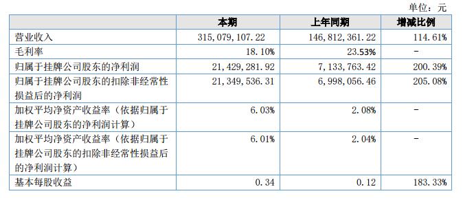 報(bào)告期內(nèi),公司實(shí)現(xiàn)銷售收入315,079,107.22元,比去年同期146,812,361.22元增長(zhǎng)114.61%;報(bào)告期內(nèi)凈利潤(rùn)21,429,281.92元,比上年同期7,133,763.42元增加14,295,518.50元,增長(zhǎng)200.39%。?
