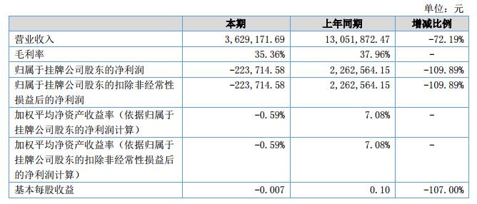 報告期內(nèi)公司實現(xiàn)營業(yè)收入362.92萬元,同比下降了72.19%;凈利潤-22.37萬元,同比下降了109.89%。?