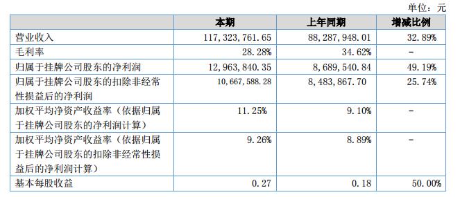 報(bào)告期內(nèi),公司實(shí)現(xiàn)營(yíng)業(yè)收入11732萬(wàn)元,同比增長(zhǎng)33%;實(shí)現(xiàn)歸屬于掛牌公司股東的凈利潤(rùn)1296萬(wàn)元,同比增長(zhǎng)49%。報(bào)告期末,公司資產(chǎn)總額21440萬(wàn)元,負(fù)債總額9606萬(wàn)元,歸屬于掛牌公司股東的所有者權(quán)益總額為11834萬(wàn)元。?