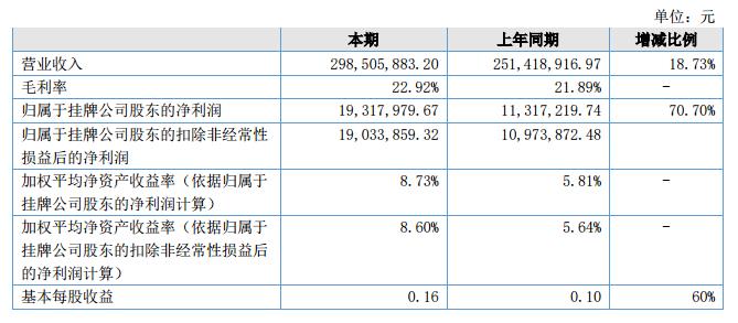 報(bào)告期內(nèi)公司實(shí)現(xiàn)營業(yè)收入為29,850.59萬元,較上年同期25,141.89萬元,上升4,708.70萬元,增長(zhǎng)比例為18.73%;營業(yè)成本23,008.70萬元,比去年同期增加了3,369.34萬元,較去年同期增加了17.16%。報(bào)告期內(nèi),公司整體毛利率為22.92%,去年同期為21.89%,上升1.03%;報(bào)告期內(nèi)公司實(shí)現(xiàn)凈利潤(rùn)1,931.80萬元,較去年同期上升800.08萬元,同比增長(zhǎng)70.70%。?