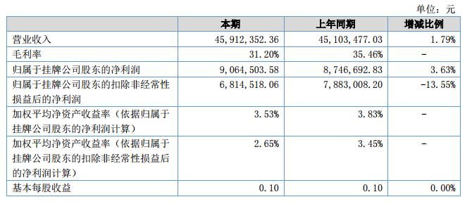 報告期內(nèi),公司實現(xiàn)營業(yè)收入4,591.24萬元,營業(yè)成本3158.87萬元;利潤總額和凈利潤分別為1,040.75萬元和906.45萬元,利潤總額比去年同期減少28.47萬元,同比負(fù)增長2.66%。凈利潤比去年同期增加31.78萬元,同比增長3.63%。截至2018年06月30日,公司總資產(chǎn)為34,676.84萬元,凈資產(chǎn)為26,234.92萬元。?