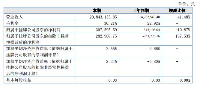 截止報(bào)告期末,公司資產(chǎn)總額25,551,655.73元,較期初25,164,960.99元增長(zhǎng)了1.54%;負(fù)債13,325,155.17元,較期初13,246,056.02元增長(zhǎng)了0.60%;凈資產(chǎn)12,226,500.56元,較期初11,918,904.97元增加了2.58%;報(bào)告期內(nèi)公司銷售收入20,843,155.85元,較去年同期14,732,543.40元增長(zhǎng)了41.48%;營(yíng)業(yè)成本14,547,127.20元,較去年同期11,356,288.16元增加了28.10%;本期毛利率為30.21%,較去年同期22.92%增長(zhǎng)31.81%;凈利潤(rùn)307,595.59元,較去年同期345,103.04元減少了10.87%,;經(jīng)營(yíng)活動(dòng)產(chǎn)生的現(xiàn)金流量?jī)纛~2,754,058.61元,轉(zhuǎn)去年同期1,153,346.88元增長(zhǎng)了138.79%。?