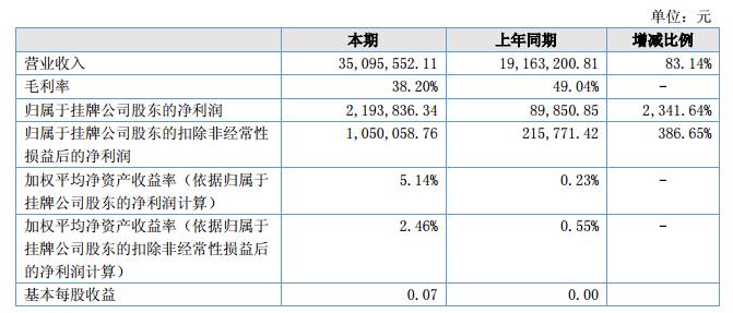2018年上半年營業(yè)收入目標3000萬元,由于擴大了經(jīng)營范圍,增強了宣傳力度,實際完成35,095,552.11元,完成計劃的117%,營業(yè)收入比上期實現(xiàn)大幅增長;2018年上半年實現(xiàn)凈利潤219萬元,凈利潤比上期增長2,341.64%;報告期內(nèi)總資產(chǎn)110,794,783.58元,去年同期總資產(chǎn)106,581,860.19元,較去年增長3.95%。?
