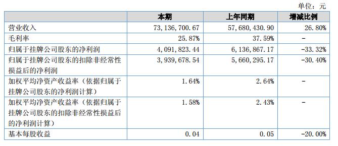 報(bào)告期內(nèi),公司實(shí)現(xiàn)營(yíng)業(yè)收入7,313.67萬(wàn)元,與去年同期同比增長(zhǎng)26.80%;營(yíng)業(yè)成本5421.64萬(wàn)元,較上年同期增長(zhǎng)50.61%;稅金及附加72.03萬(wàn)元,上年為-52.33萬(wàn)元;公司實(shí)現(xiàn)凈利潤(rùn)409.18萬(wàn)元,同比減少33.32%。