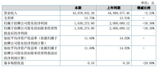 報告期內(nèi)公司實現(xiàn)營業(yè)收入43,978,932.38元,較去年同期下降2.23%;凈利潤1,638,273.80元,較去年同期下降18.36%;經(jīng)營活動產(chǎn)生的現(xiàn)金流量凈額-2,533,414.29,較去年同期下降了235.00%。?