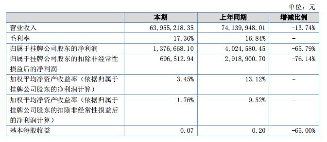 報告期內(nèi),公司經(jīng)營實(shí)現(xiàn)營業(yè)收入63,955,218.35元,同比下降13.74%;歸屬于掛牌公司股東的凈利潤為1,376,668.10元,同比下降了65.79%;總資產(chǎn)84,251,578.35元,比期初減少了3.46%。?