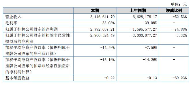 報(bào)告期內(nèi)公司營(yíng)業(yè)收入3,146,641.70元,較上年同期減少52.53%;公司實(shí)現(xiàn)凈利潤(rùn)-2,792,057.21元,較上年同期減少74.88%。?