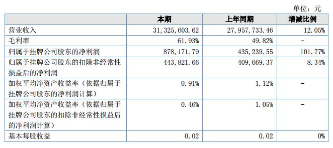 報(bào)告期內(nèi),公司實(shí)現(xiàn)營(yíng)業(yè)收入31,325,603.62元,較上年同期增長(zhǎng)3,367,870.16元,增長(zhǎng)比率為12.05%;凈利潤(rùn)為878,171.79元,較上年同期增加442,932.24元,較上年同期增長(zhǎng)101.77%。?