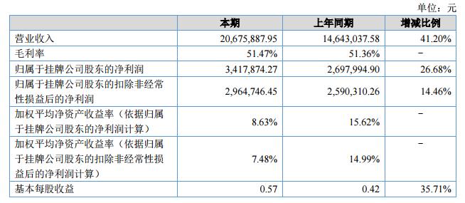 報告期內(nèi)公司實現(xiàn)營業(yè)收入2,067.59萬元,上年度同期營業(yè)收入為1,464.30萬元,同比增長41.20%。報告期內(nèi)公司實現(xiàn)凈利潤341.79萬元,上年度同期凈利潤為269.80萬元,同比增長26.68%。報告期內(nèi)公司經(jīng)營活動產(chǎn)生的現(xiàn)金流量為-938.06萬元,上年同期為-180.32萬元,同比下降420.21%。?