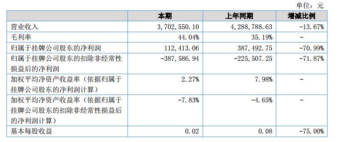 報告期內公司營業(yè)收入370.26萬元,同比下降13.67%,營業(yè)成本207.18萬元,凈利潤13.26萬元。?