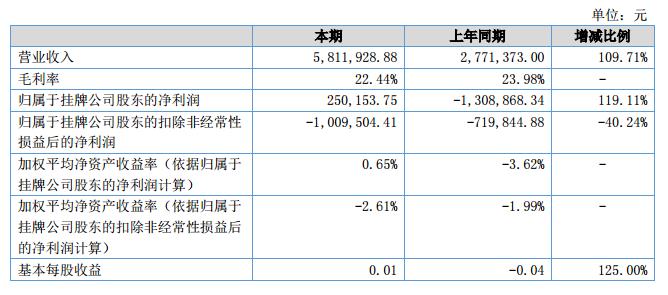 報(bào)告期內(nèi),公司實(shí)現(xiàn)營(yíng)業(yè)收入5,811,928.88元,去年同期收入2,771,373.00元,比去年同期收入增加3,040,555.88元,增長(zhǎng)比例為109.71%;歸屬于母公司所有者的凈利潤(rùn)250,153.75元,比去年同期凈利潤(rùn)-1,308,868.34元增加1,559,022.09元,增長(zhǎng)比例為119.11%。截止2018年6月30日,公司總資產(chǎn)為41,553,637.51元,比去年同期總資產(chǎn)41,990,507.80元減少1.04%;凈資產(chǎn)為38,745,890.04元,比上年期末凈資產(chǎn)38,495,736.30元增加0.65%,經(jīng)營(yíng)活動(dòng)產(chǎn)生的現(xiàn)金凈流入-515,215.85元,比上年同期現(xiàn)金流量?jī)纛~增加65.36%。?