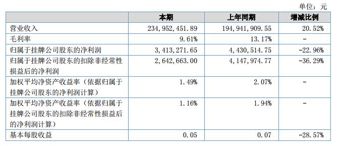 報告期內(nèi),實現(xiàn)營業(yè)收入23,495萬元,較上年同期19,494萬元,增長20.52%,實現(xiàn)凈利潤285萬元,較上年同期443萬元,下降35.67%,其主要由于人工成本大幅上升及材料價格上漲的影響。?