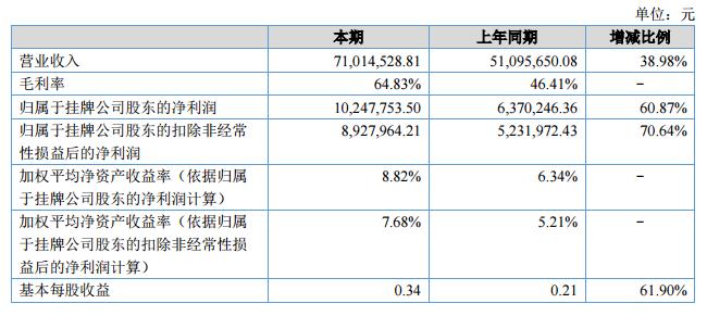 報(bào)告期內(nèi),公司實(shí)現(xiàn)營業(yè)收入7,101.45萬元,較之上年同期的5,109.57萬元,同期增長38.98%;銷售毛利率為64.83%,較上年同期增長18.42個(gè)百分點(diǎn);公司實(shí)現(xiàn)凈利潤1,024.78萬元,較上年同期增加60.87%,收入和凈利的增長主要原因是公司加大研發(fā)投入,開發(fā)新產(chǎn)品帶來高毛利產(chǎn)品銷售擴(kuò)大占比上升,從而帶來營業(yè)收入大幅上升,同時(shí)產(chǎn)能擴(kuò)大導(dǎo)致產(chǎn)品成本下降所致。?