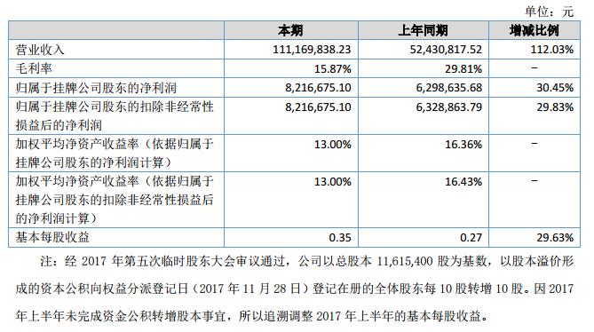 報告期內(nèi),公司實現(xiàn)營業(yè)收入11,116.98萬元,較上年同期增長112.03%;本期公司實現(xiàn)凈利潤821.67萬元,較上年同期上升30.45%;本期毛利率為15.87%,?