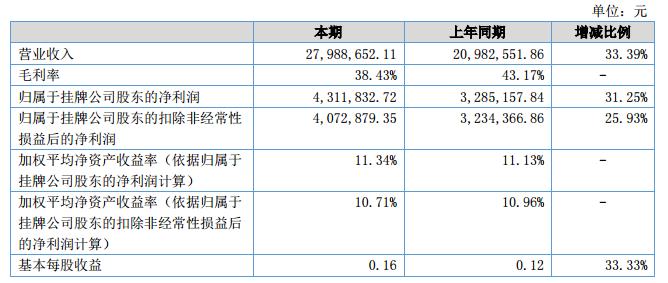 報告期內(nèi),公司實現(xiàn)營業(yè)收入27,988,652.11元,較上年同期年度增加了33.39%,實現(xiàn)凈利潤4,311,832.72元,較上年同期年度增加了31.25%。?