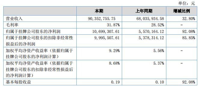 報(bào)告期內(nèi)公司實(shí)現(xiàn)營(yíng)業(yè)收入9,035.27萬(wàn)元,比去年同期增加2,231.68萬(wàn)元,增長(zhǎng)32.80%;2018年1-6月凈利潤(rùn)1,069.93萬(wàn)元,比去年同期增加512.91萬(wàn)元,增長(zhǎng)92.08%??傎Y產(chǎn)23,003.27萬(wàn)元,比去年同期增加4,020.66萬(wàn)元,增長(zhǎng)25.02%;歸屬于掛牌公司凈資產(chǎn)為12,049.68萬(wàn)元;比去年同期增加1750.40萬(wàn)元,增長(zhǎng)17.00%。?