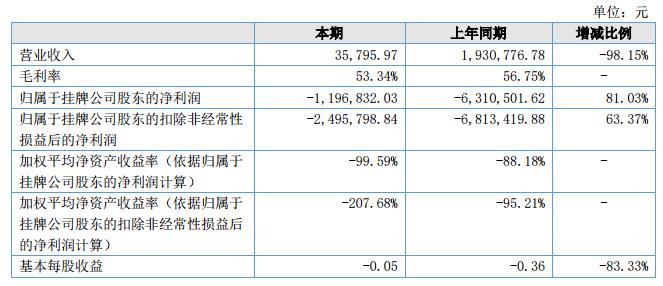 報告期內公司營業(yè)收入35,795.97元,收入同比下降98.15%,主要原因是公司為提高系統(tǒng)的普及推廣,為餐飲企業(yè)提供免費入駐平臺,以提高商家使用系統(tǒng)的粘性;當期營業(yè)成本16,703.3元,歸屬于掛牌公司股東凈利潤-1,196,832.03,同比利潤虧損減少81.03%。?