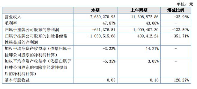營(yíng)業(yè)收入本期763.93萬(wàn)元,同比減少375.96萬(wàn)元,減少比例32.98%;實(shí)現(xiàn)的凈利潤(rùn)-83.90萬(wàn)元,上年同期為190.94萬(wàn)元。?