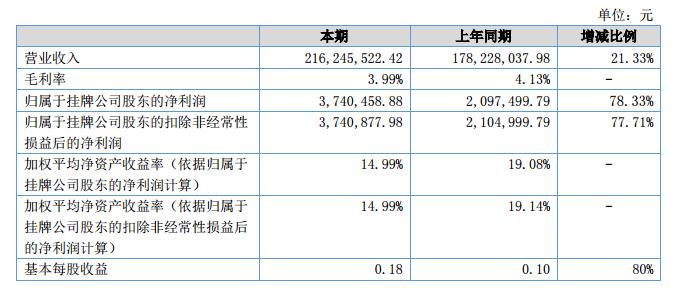 挖貝網(wǎng)9月12日,中富泰科(證券代碼:872872)近日公布的2018年半年報(bào)顯示,截至2018年6月30日,企業(yè)實(shí)現(xiàn)營收2.16億元;歸屬于掛牌公司股東的凈利潤為374.04萬元。