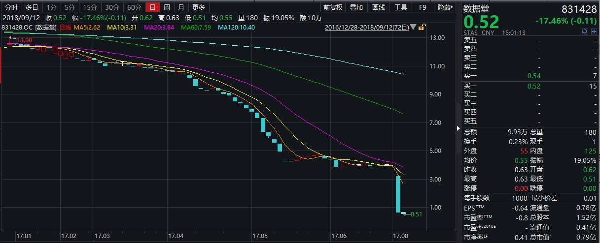 挖貝網 9月12日消息,新三板掛牌公司數據堂(831428)股票自2017年8月起停牌,歷時13個月,9月11日,股票恢復轉讓。在恢復轉讓的第一天,數據堂股票暴跌了84%,前期參與進來的投資者被套牢。
