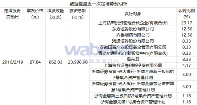 截至目前,2016年2月參與到數據堂定增中的多家機構浮虧95.7%(考慮分紅除權因素后)。