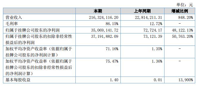 報(bào)告期內(nèi)公司實(shí)現(xiàn)營(yíng)業(yè)收入216,324,116.20元,相對(duì)上年同期增加848.20%;報(bào)告期實(shí)現(xiàn)合并歸屬于掛牌公司股東的凈利潤(rùn)35,069,141.72元,相對(duì)上年同期增加48,122.13%。?