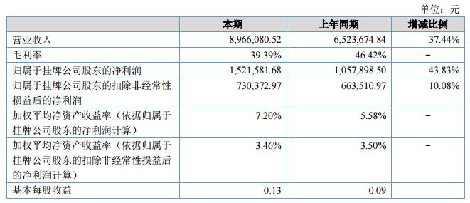 報告期內,公司實現(xiàn)營業(yè)收入8,966,080.52元,凈利潤1,521,581.68元。期末公司總資產(chǎn)為27,499,122.60元,凈資產(chǎn)為21,128,474.49元。?
