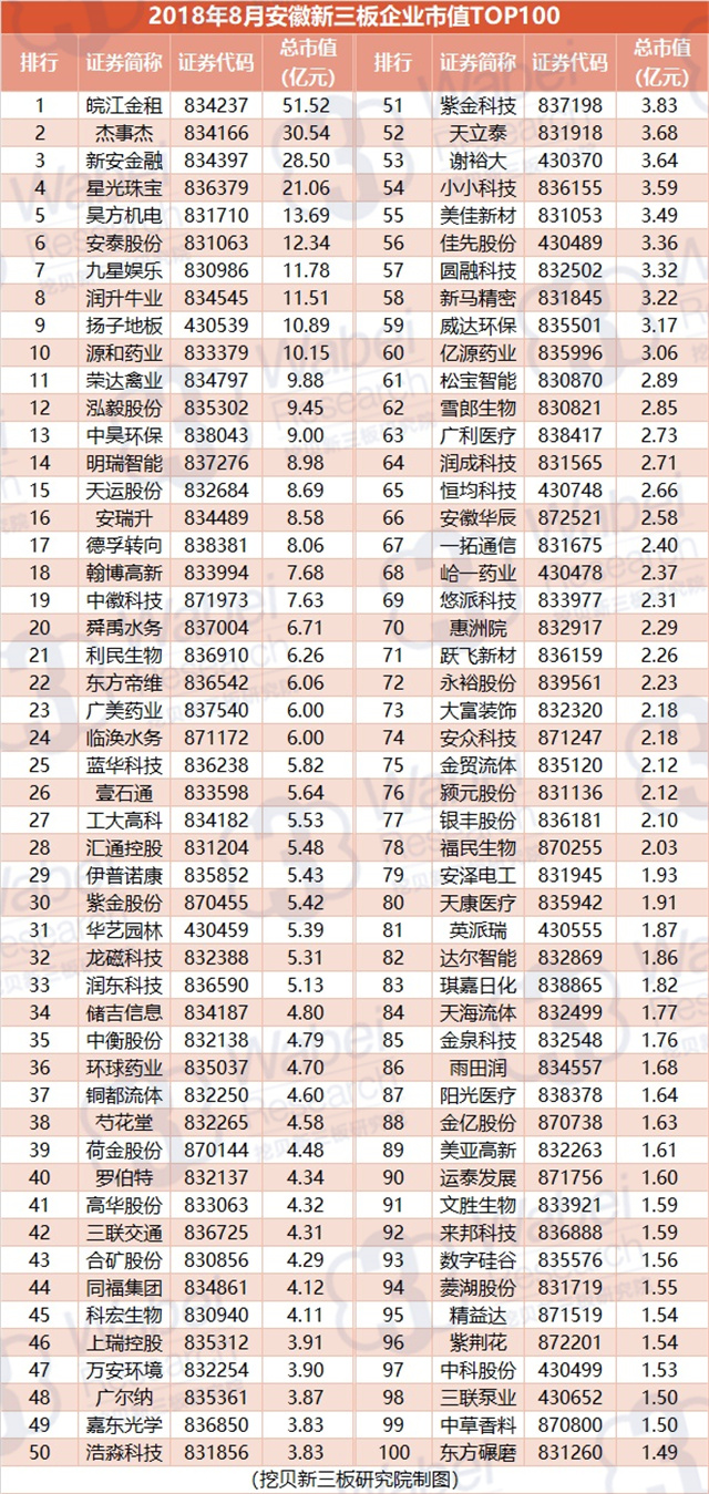 附:2018年8月安徽新三板企業(yè)市值TOP100