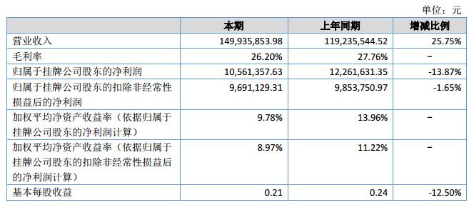 報告期內,公司實現(xiàn)營業(yè)收入149,935,853.98元,較上年同期增加25.75%,主要原因是國外市場開拓成效大業(yè)績上升;實現(xiàn)歸屬掛牌公司所有者凈利潤10,561,357.63元;公司總資產228,185,226.03元,較上年同期增加0.45%;歸屬掛牌公司所有者權益86,744,296.01元,較上年同期減少15.54%;經營活動產生的現(xiàn)金流量凈額-946,981.73元。?