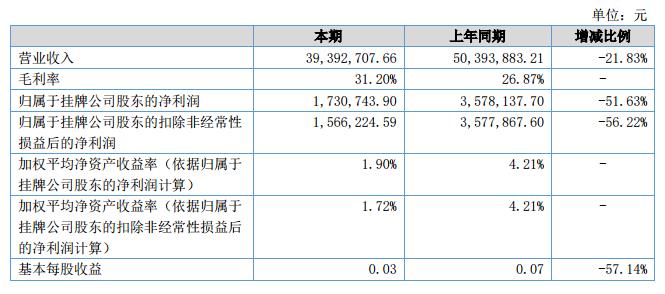 內(nèi)公司營業(yè)收入39,392,707.66元,比上年同期減少21.83%,營業(yè)成本27,100,275.08比上年同期減少26.46%,毛利率為31.20%,上年同期毛利率為26.87%;報告期內(nèi)公司凈利潤1,730,743.90元,比上年同期減少51.63%?。