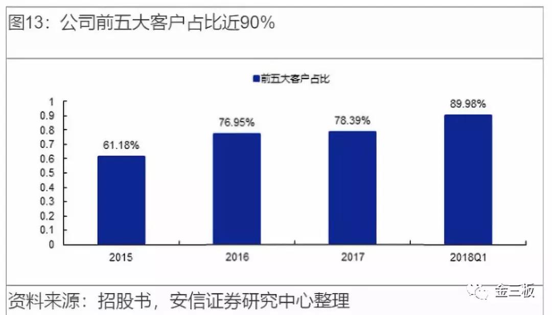 加上藍思科技,2015-2017年以及2018年一季度,公司向前五大客戶銷售占比分別為61.18%、 76.95%、78.39%及89.98%。