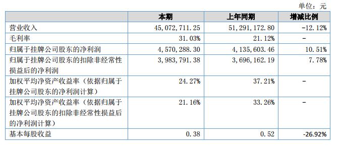 報告期公司營業(yè)收入4,507.27萬元,較上年同期下降621.85萬元,同比下降12.12%;資產(chǎn)總額4,383.86萬元,較上年同期增長1,154.88萬元,同比增長35.77%;凈資產(chǎn)2,109.59萬元,較上年同期增長791.35萬元,同比增長60.03%;凈利潤457.30萬元,較上年同期增長43.64萬元,較上年同期增長10.55%,毛利率31.03%,較上年同期增長46.99%。?