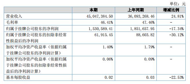 報告期內(nèi)公司實現(xiàn)營業(yè)收入45,047,384.50元,同比增加24.81%;報告期內(nèi),公司歸屬于掛牌公司凈利潤為1,530,589.41元,較上年同期減少17.34%。?