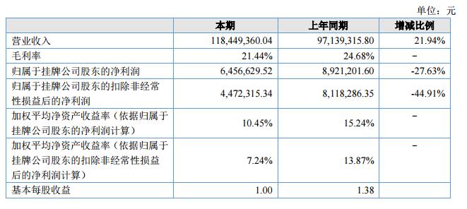 報告期內(nèi)公司實現(xiàn)營業(yè)收入118,449,360.04元,較上年同期增加21.94%,主要原因是公司品質(zhì)穩(wěn)定,客戶市場份額持續(xù)擴大原因;凈利潤6,114,069.32元,較上年同期8,430,805.42元,利潤率下降27.48%?
