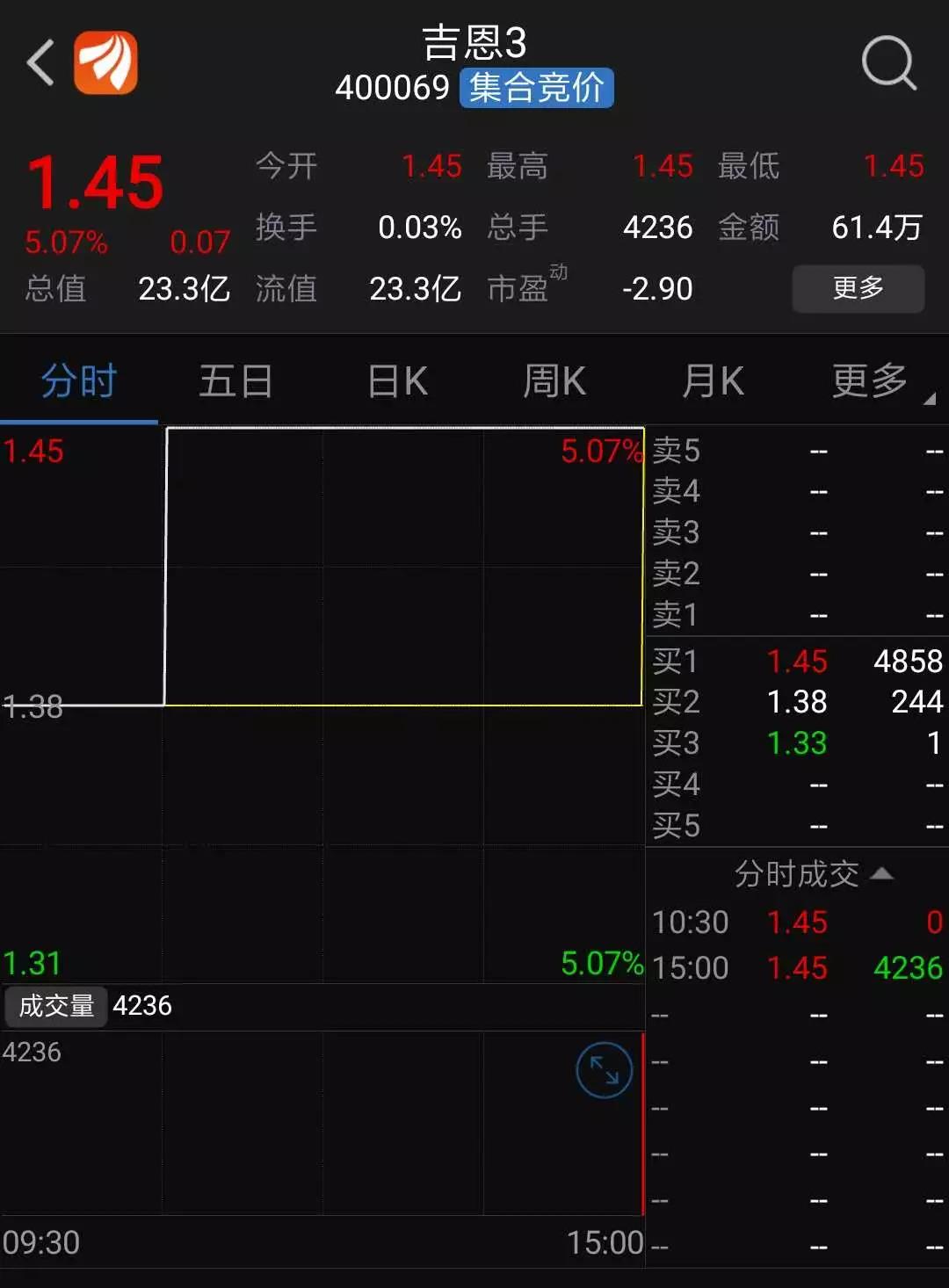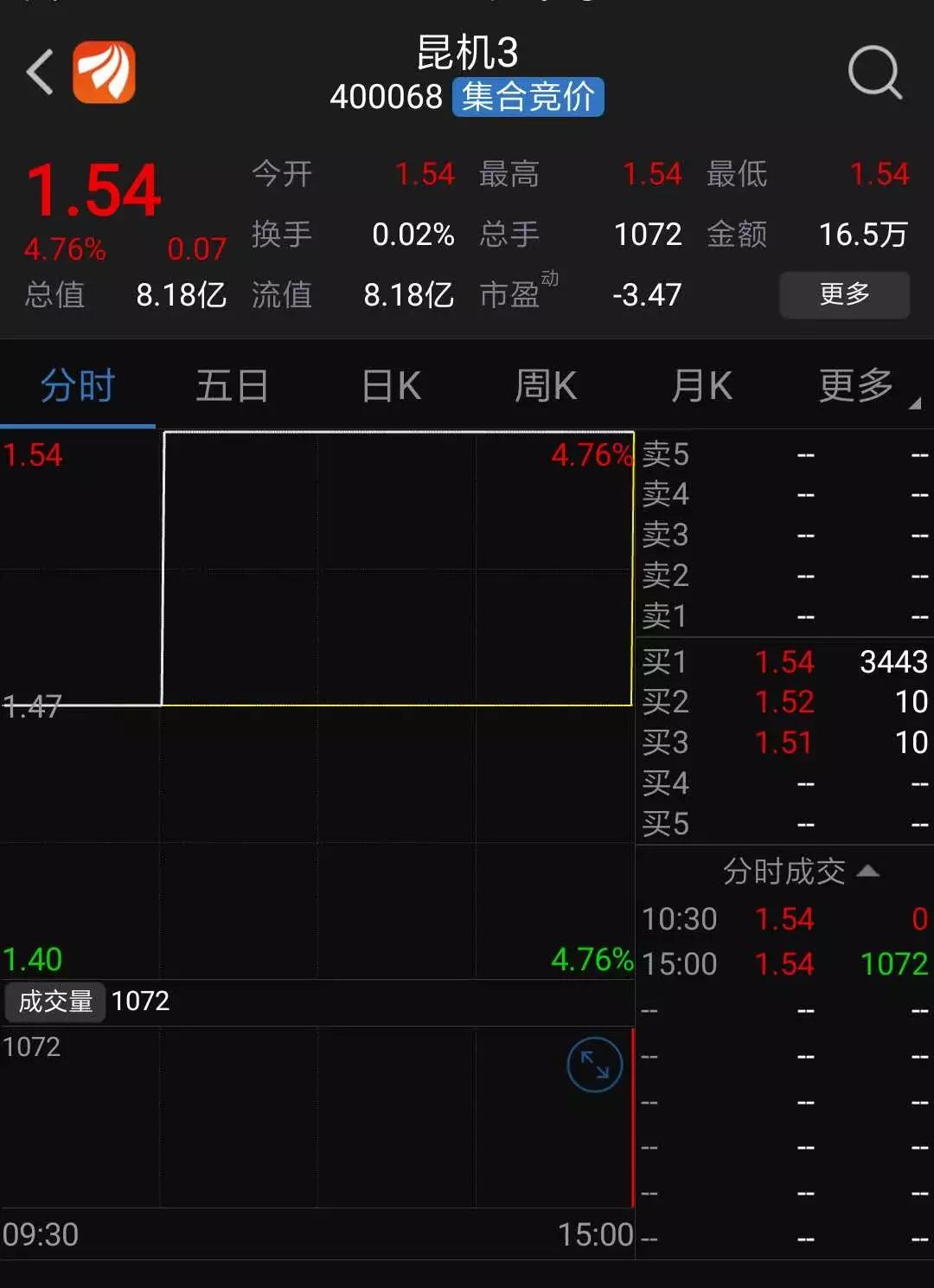 今天開盤后,上午10點30分首次揭示成交價格時,昆機(jī)3報價為1.54元/股,漲幅4.76%,達(dá)到漲停;吉恩3報價為1.45元/股,漲幅達(dá)5.07%,同為漲停。