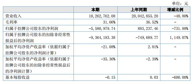 報告期內(nèi),公司實現(xiàn)營業(yè)收入1,026.27萬元,比去年同期下降48.80%,凈利潤為-558.10萬元,較去年同期下降比例較大。?