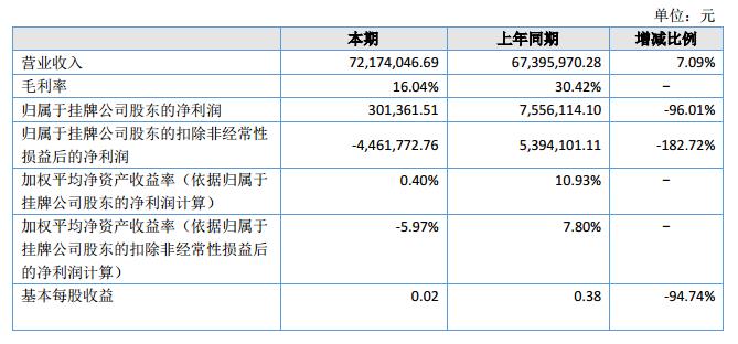 報告期內(nèi),公司實現(xiàn)營業(yè)收入72,174,046.69元,較上期增長4,778,076.41元,同比上升7.09%,凈利潤301,361.51元,較上期下降7,254,752.59元,同比下降96.01%。?