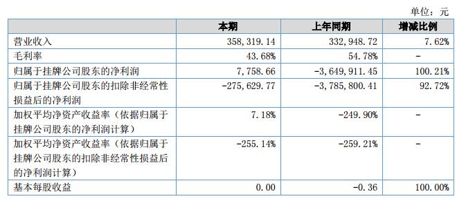 報告期內(nèi),公司實現(xiàn)營業(yè)收入358,319.14元,較上期增加25,370.42元,較上年同期增長7.62%,公司營業(yè)收入較上期增長較小;實現(xiàn)歸屬于掛牌公司股東的凈利潤7,758.66元,較上期增加3,657,670.11元,較上年同期增長100.21%。?