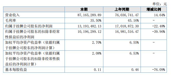 報(bào)告期內(nèi)公司實(shí)現(xiàn)營(yíng)業(yè)收入8,716.53萬(wàn)元,較上年同期增加了1,112.85萬(wàn)元,增長(zhǎng)比例14.64%;實(shí)現(xiàn)凈利潤(rùn)13,282,314.74元,較上年同期下降3,736,557,56元,同比下降。?