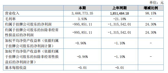 2018年上半年,公司營(yíng)業(yè)收入為3,668,773.35元,與上年同期相比增加98.15%,主要原因是隨著公司恢復(fù)生產(chǎn),公司的銷(xiāo)售渠道也逐步恢復(fù),銷(xiāo)售額也逐步增加。凈利潤(rùn)為-995,851.11元,主要原因是公司目前產(chǎn)能恢復(fù)有限,產(chǎn)品單位固定成本分?jǐn)傒^大,對(duì)毛利率影響較大,造成凈利潤(rùn)暫時(shí)無(wú)法覆蓋成本。?
