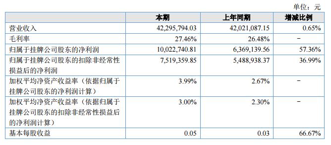 報告期內公司實現營業(yè)收入4229.58萬元,同比2017年的4202.11萬元增長0.65%;實現利潤總額1,113.98萬元,同比749.31增長49.00%;凈利潤1,002.27萬元,同比636.91萬元增長57%。?