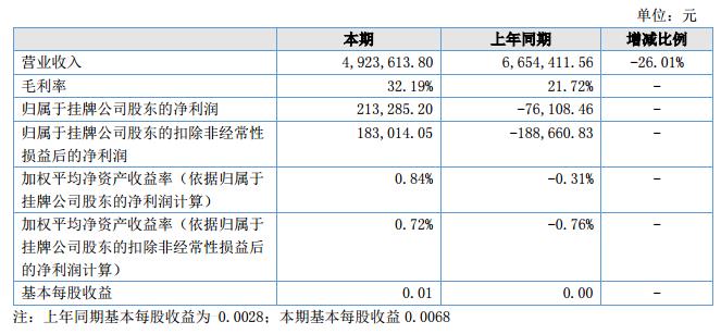 報(bào)告期內(nèi),公司實(shí)現(xiàn)營(yíng)業(yè)收入4,923,613.80元,較上期減少了26.01%,從報(bào)告期內(nèi)經(jīng)營(yíng)情況來(lái)看,公司主要客戶(hù)未發(fā)生大變化,產(chǎn)品毛利率由21.72%增長(zhǎng)至32.19%發(fā)生明顯變化。?
